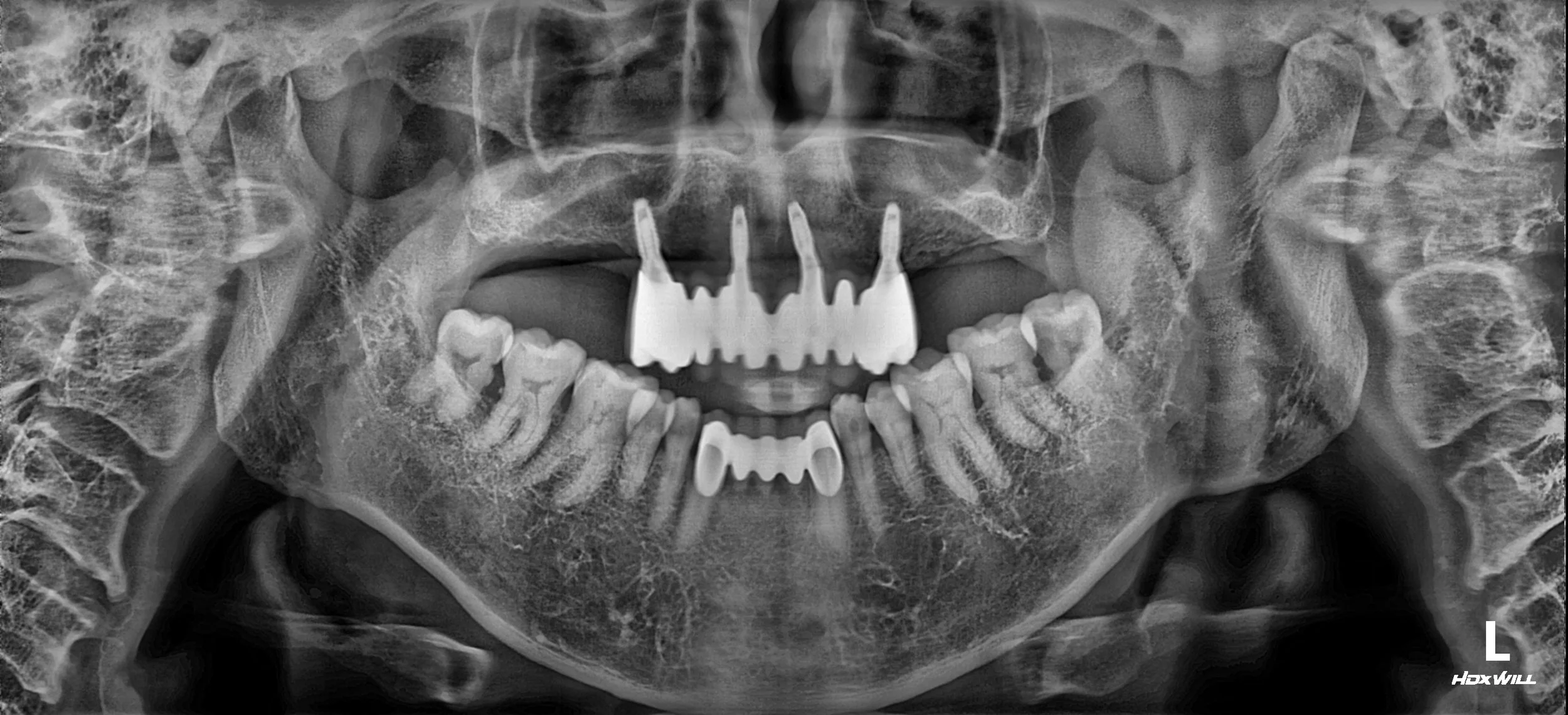 While the maxillary dentition showed significant deterioration, the mandibular posterior teeth remained relatively well preserved.