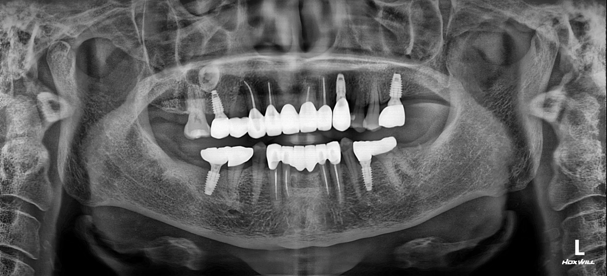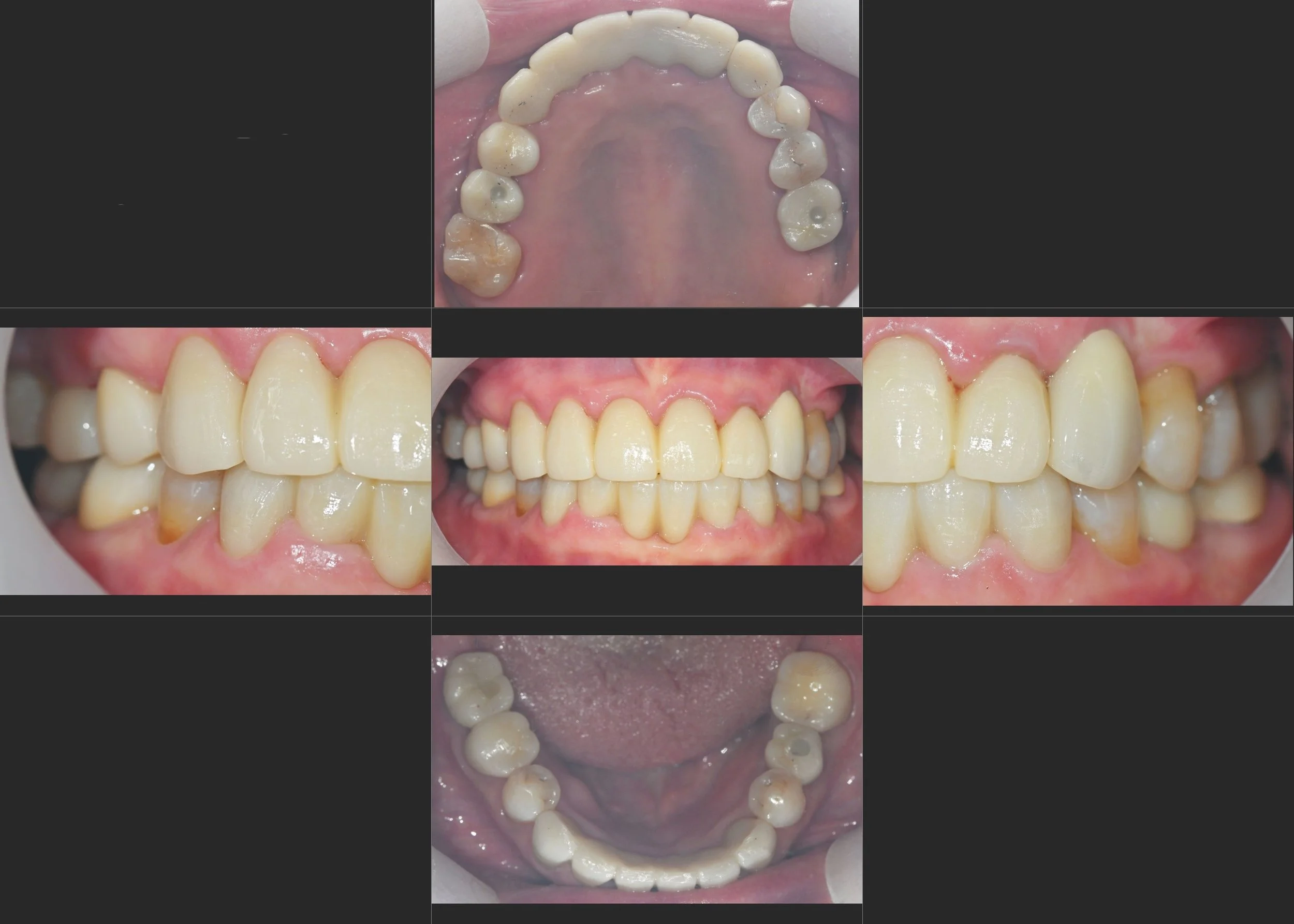 A female patient in her 50s presented with significant functional impairment due to extensive tooth loss, generalized severe periodontitis, and multiple dental caries. Her occlusal plane was completely collapsed, leading to an unstable bite and reduced chewing efficiency.