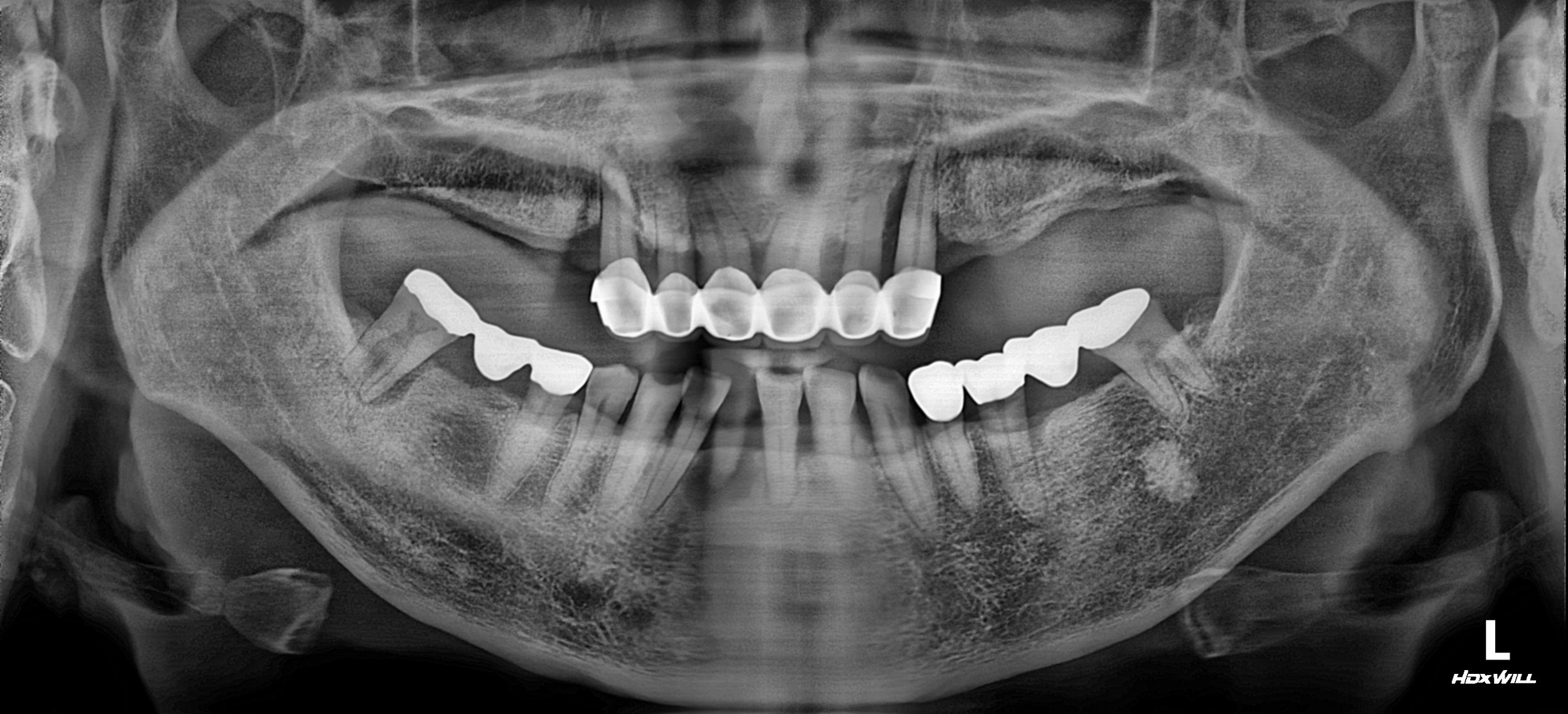 A male patient in his 60s presented with a severely compromised oral condition. Having relied on ill-fitting and unusable partial dentures for a long period, his remaining dentition had deteriorated significantly. Key clinical findings included: