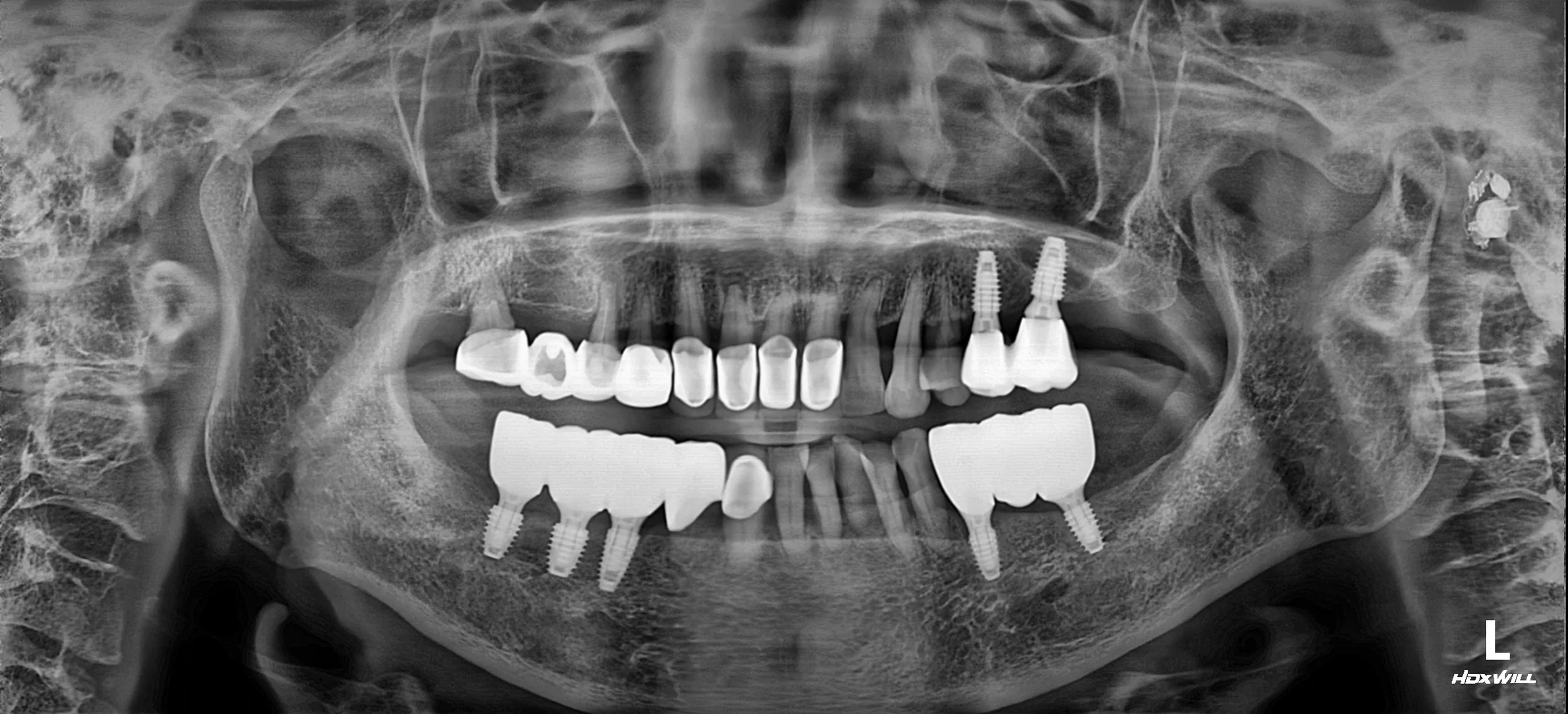 Pre-operative Radiograph (OPG) OPG showing multiple missing teeth, failing bridge abutments, and severe horizontal bone loss.
